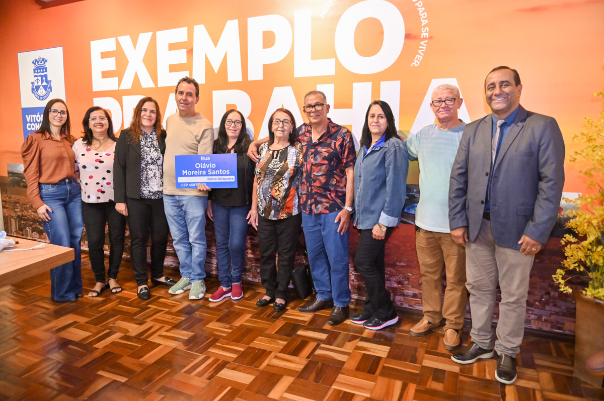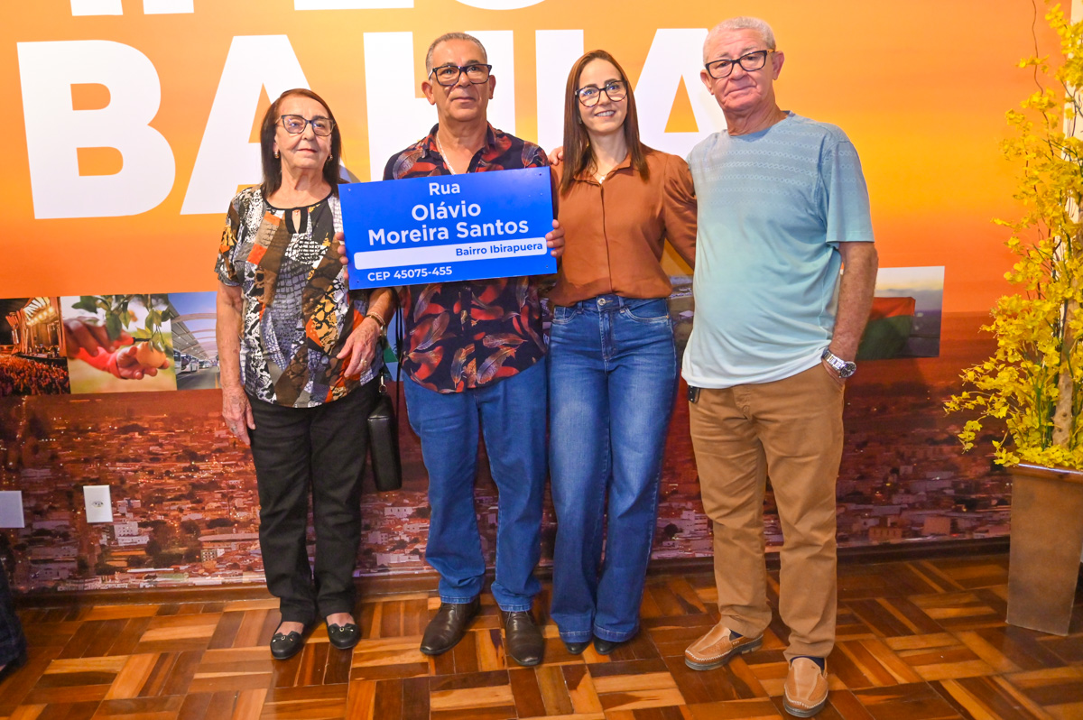 Na manhã desta sexta-feira (27), familiares de Olávio Moreira Santos compareceram ao salão nobre do Palácio da Joia do Sertão Baiano, sede do Governo Municipal, para a entrega da placa que passa a dar o nome dele à uma rua do bairro Ibirapuera, após a sanção da lei Nº 3.132/2026 , na última quinta-feira (26). A visita foi articulada pelo vereador Ricardo Babão, autor do projeto de lei que propôs a homenagem.